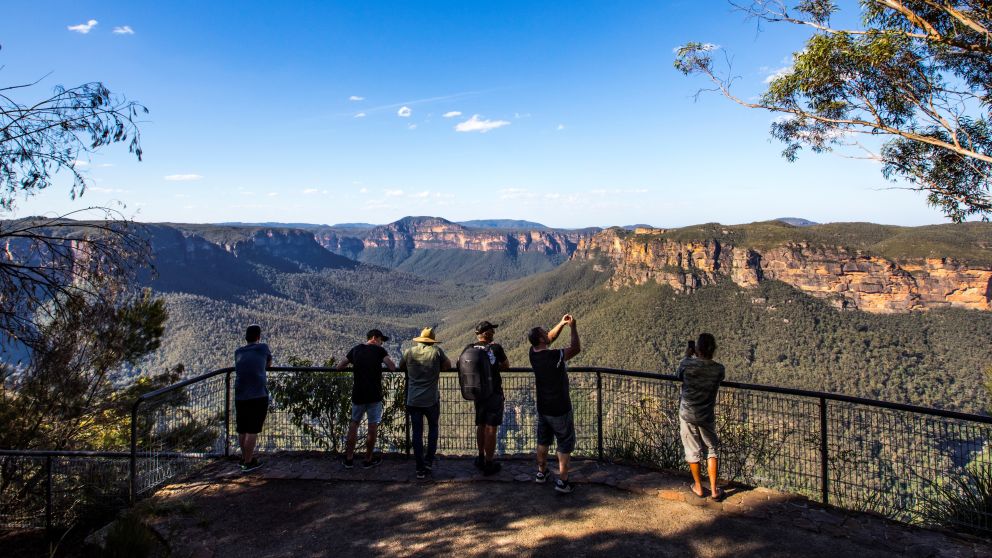 Tourists enjoying the views across the Grose Valley at Evans Lookout in Blackheath, Katoomba Area