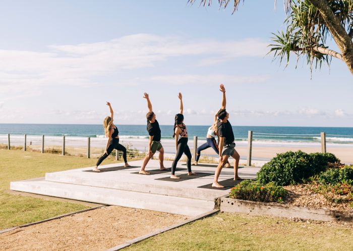 Elements of Byron guests enjoying morning beachfront yoga sessions, Byron Bay