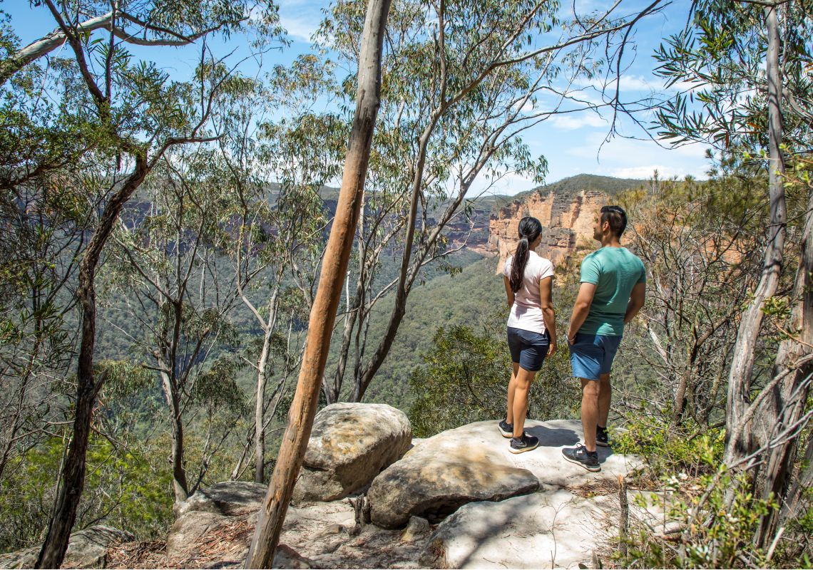 Tourists enjoying the views across the Grose Valley at Evans Lookout in Blackheath, Katoomba Area
