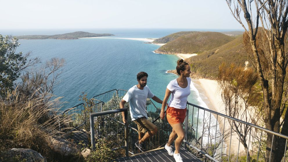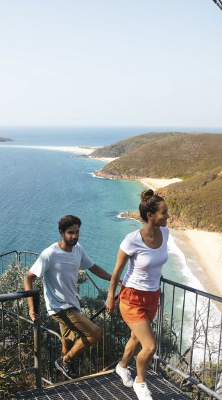Couple enjoying the coastal views along Tomaree Head Summit Walk, Port Stephens