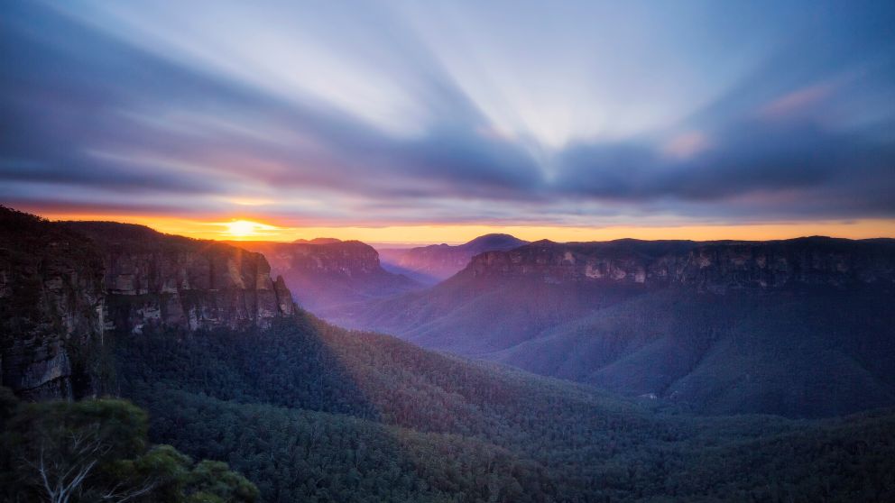 Sun setting over the Grose Valley in the Blue Mountains National Park